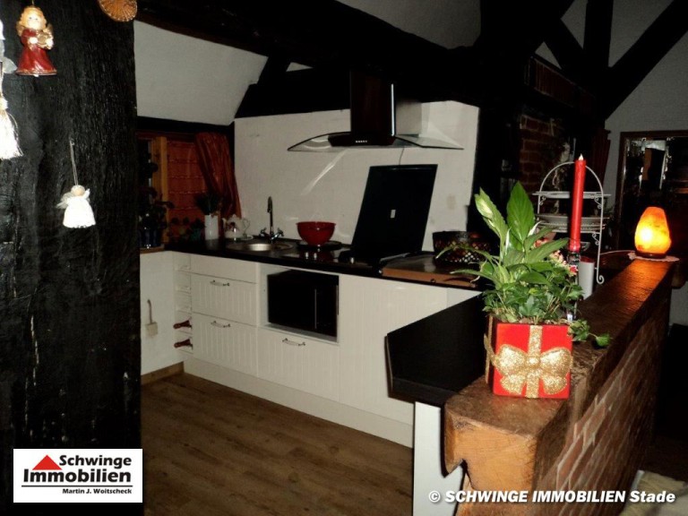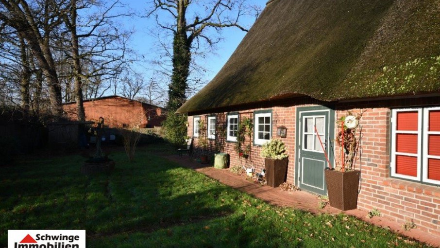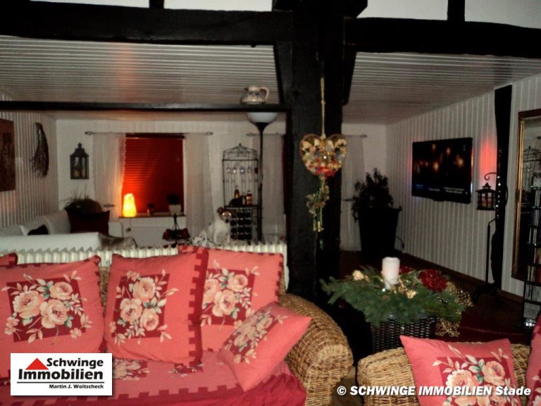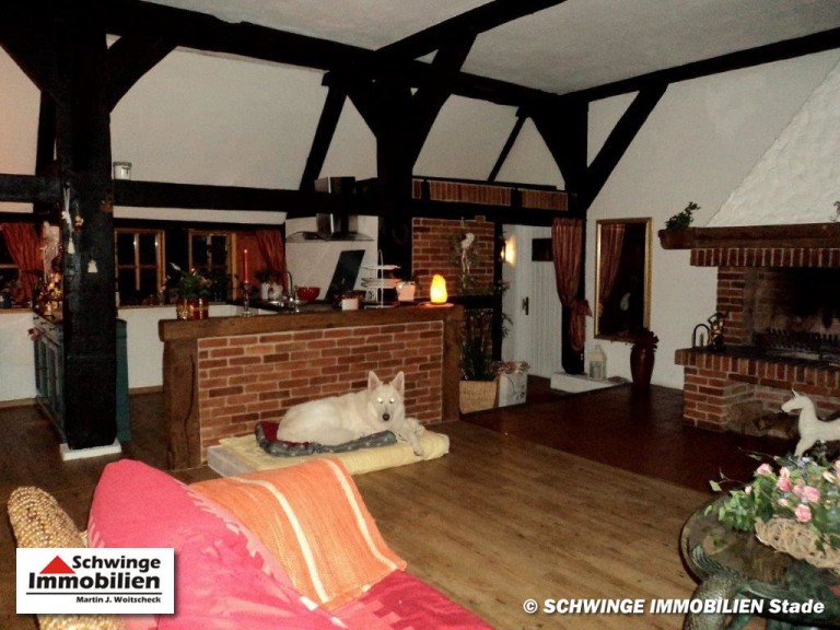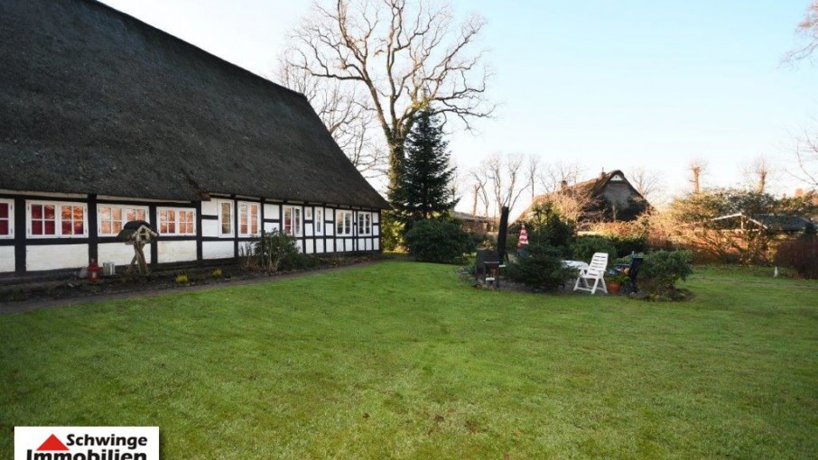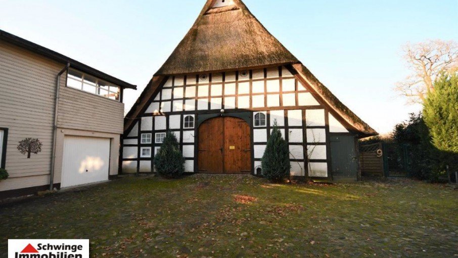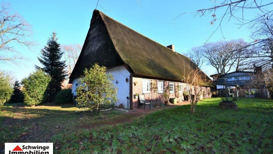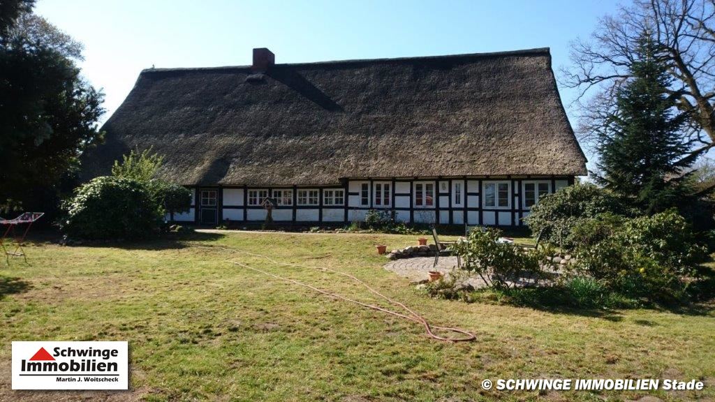 In ruhiger und bevorzugter Lage von Hammah ( Landkreis Stade ) wurde dieses Fachwerkhaus unter Reet um 1820 errichtet und zählt heute zu den ältesten Gebäuden der Ortschaft. Das Reetdachhaus ist umgeben von einem schön angelegten Garten mit altem Baumbestand. Die heutige Wohnfläche von ca. 220 m² Größe ist an zwei Parteien vermietet und erstreckt sich über eine 6 Zimmer Aufteilung zzgl. 3 Abstellräumen und den Tennenbereich – diese wird zum heutigen Zeitpunkt als Garage genutzt. Ein Doppelcarport am rechten Grundstücksbereich wird von dem zweiten Mieter genutzt. Die gesamte Grundstücksfläche von 2.013 m² Größe ist mit einem Doppelstabmatten-Zaun eingefriedet. Ja, das kann sich schon sehen lassen!